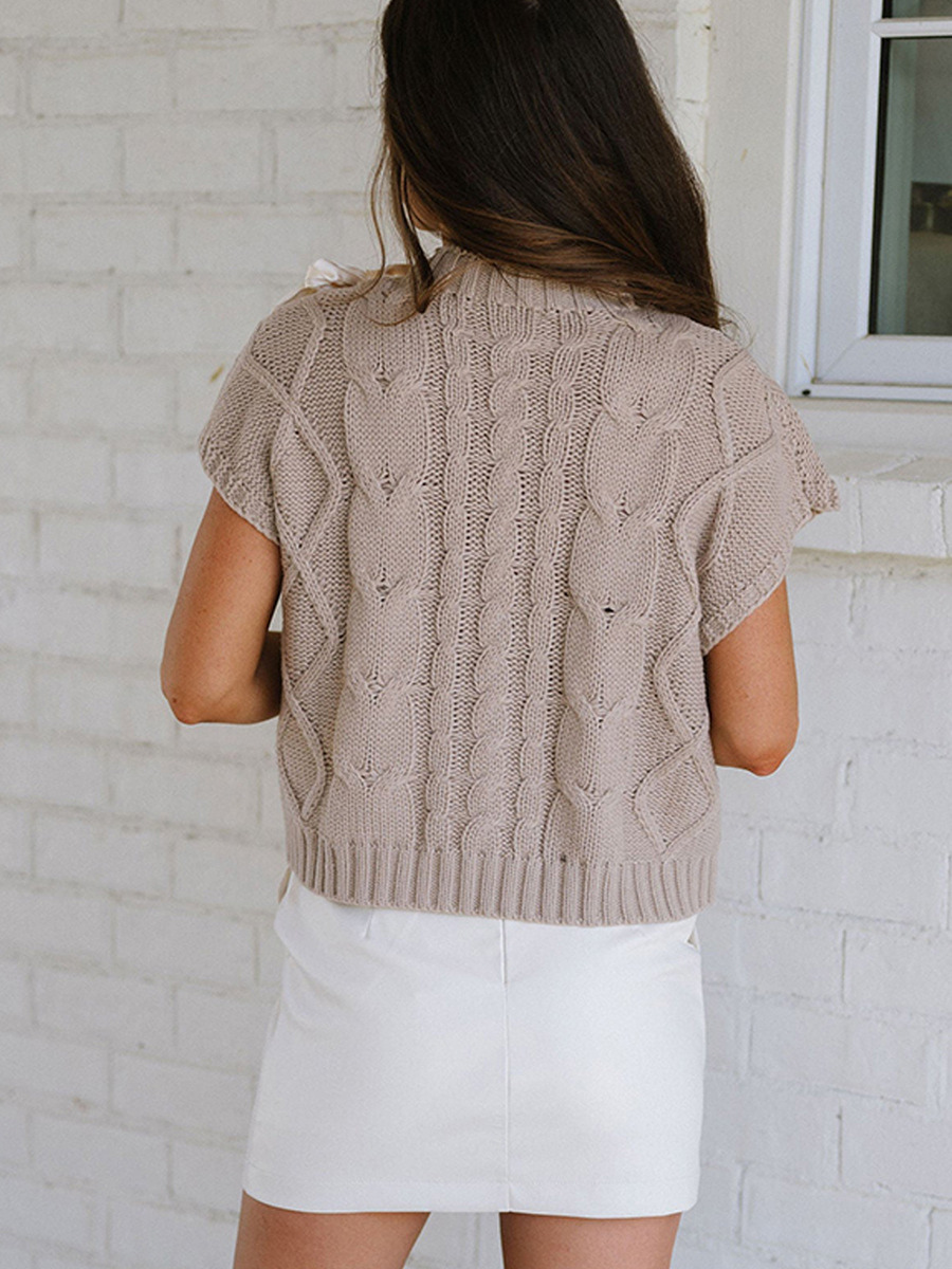 Women's round neck short sleeve pullover top European and American design ribbon bow sweater
